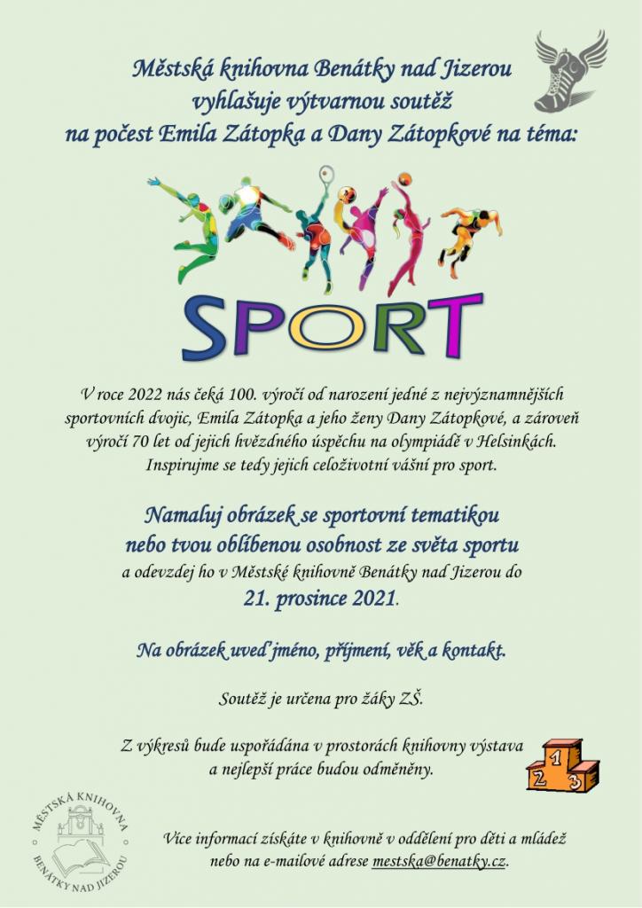 Městská knihovna Benátky nad Jizerou vyhlašuje výtvarnou soutěž na téma SPORT. Své výkresy odevzdávejte do 21. prosince 2021 v Městské knihovně (oddělení pro děti a mládež – 1. patro).