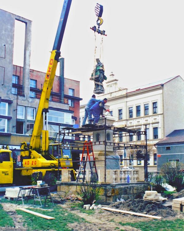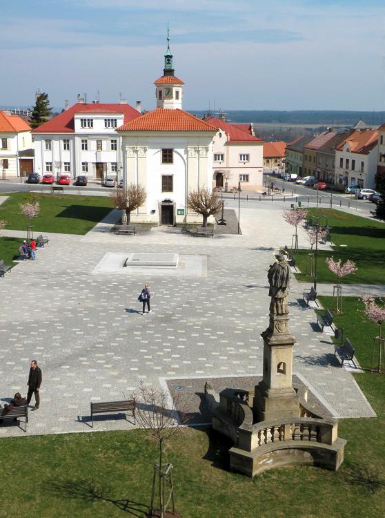Na jihozápadní straně novobenáteckého náměstí, v místech kde stával městský pranýř, nechal hrabě Arnošt Bohumír ze Schützenu a Leopoldheimu, majitel benáteckého panství, vztyčit pomník uctívaného Jana Nepomuckého.