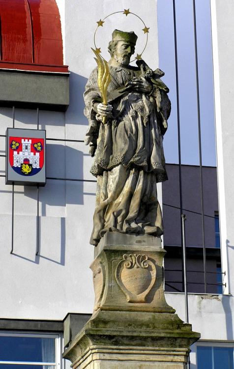 Na podstavci čtvercovém půdorysu s pískovcovou balustrádou je umístěn hranolový sokl datovaný rokem 1693. Světcova socha na něm umístěná je mladší a také její hlava není původní. Zajímavé je i kolorování sochy v minulosti několikrát prováděné. Původní barva byla bílá, na to byl pestře omalován s šedým kožíškem, bílou rochetou, černým spodním šatem, obličej i ruce tělové barvy. Potom přišla doba kdy byl kanárkově žlutý, zásluhou bohatého mecenáše byl i celý zlatý, následovaly tři nátěry šedou barvou. Socha je ze slánského pískovce, v soklu jsou provrtány čtyři otvory, tvořící malou kapličku, která sloužila za relikviář a v době pobožností v ní byla umístěna monstrance. Pod kapličkou jsou znázorněny alianční znaky hraběte ze Schützenu a jeho manželky Zuzany hraběnky z Kufštejna. Socha byla několikrát opravována, naposledy prošla nákladnou generální opravou v roce 2001, kdy byla celá rozebrána, vadné části vyměněny a opět složena do původní podoby.