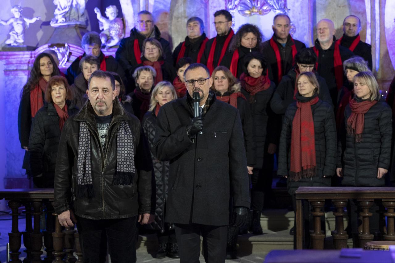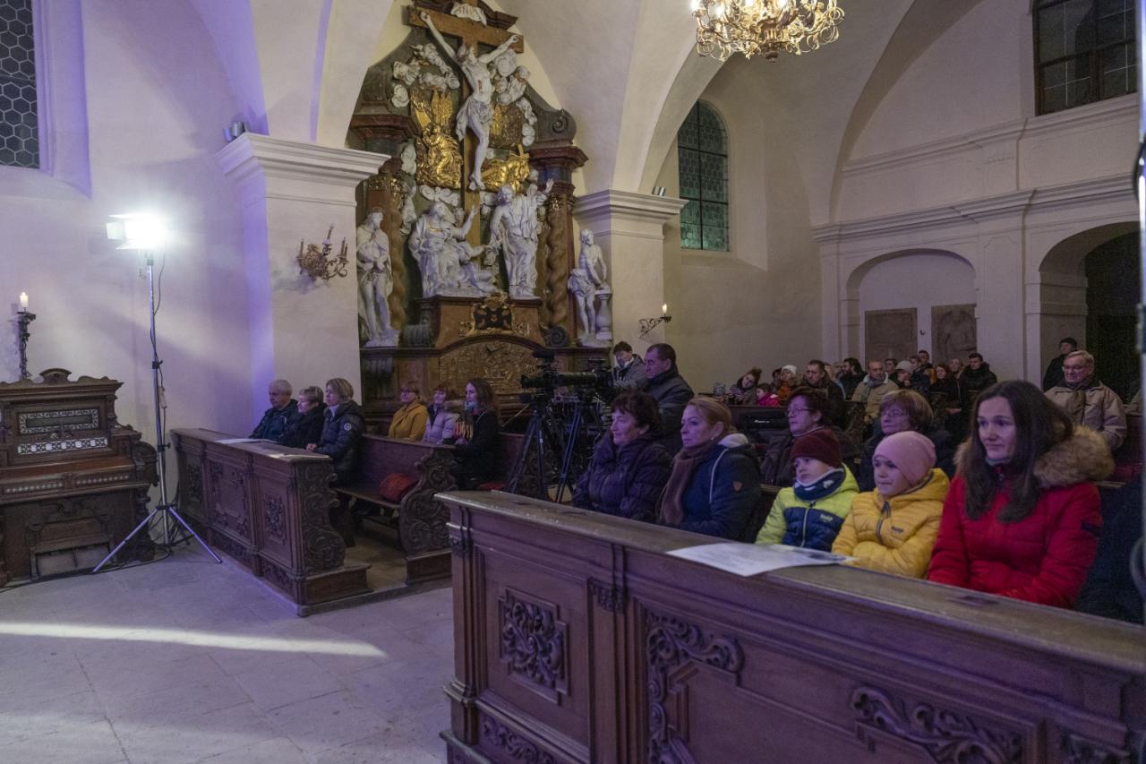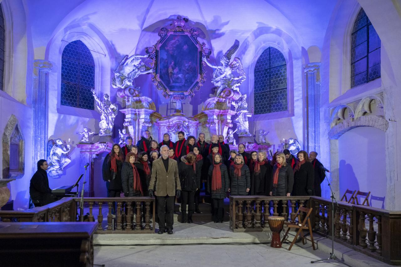 Charitativní koncert v kostele na zámku 3. prosince 2022. Smíšený pěvecký sbor Smetana. Pořádá Správa městských lesů a Město Benátky nad Jizerou.