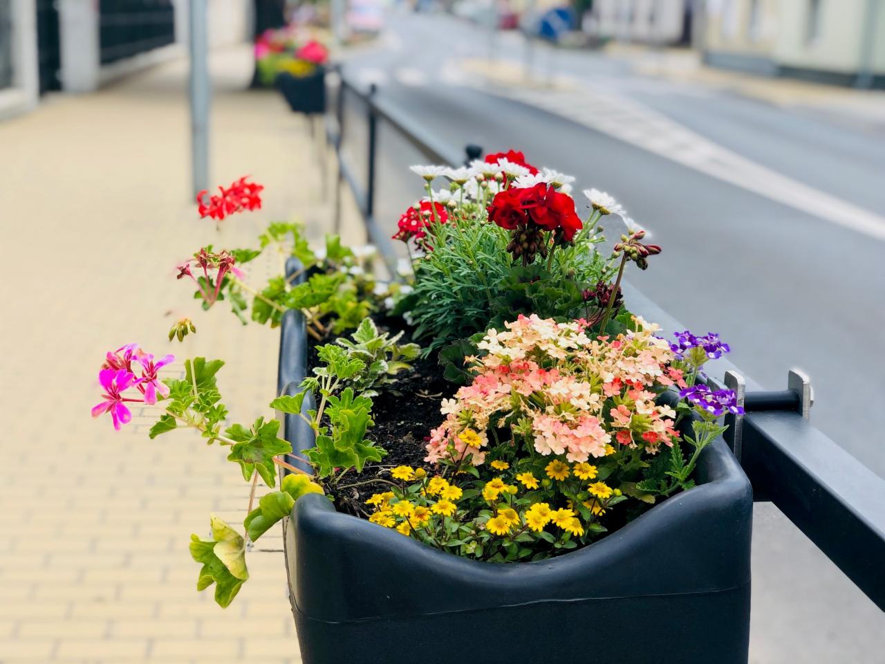 Závěsné květináče v ulici Tř. Osvob. polit. vězňů